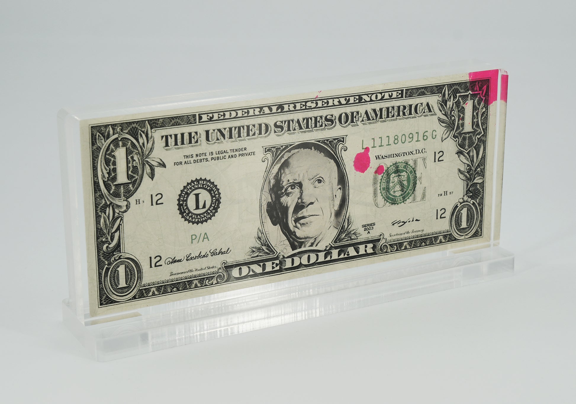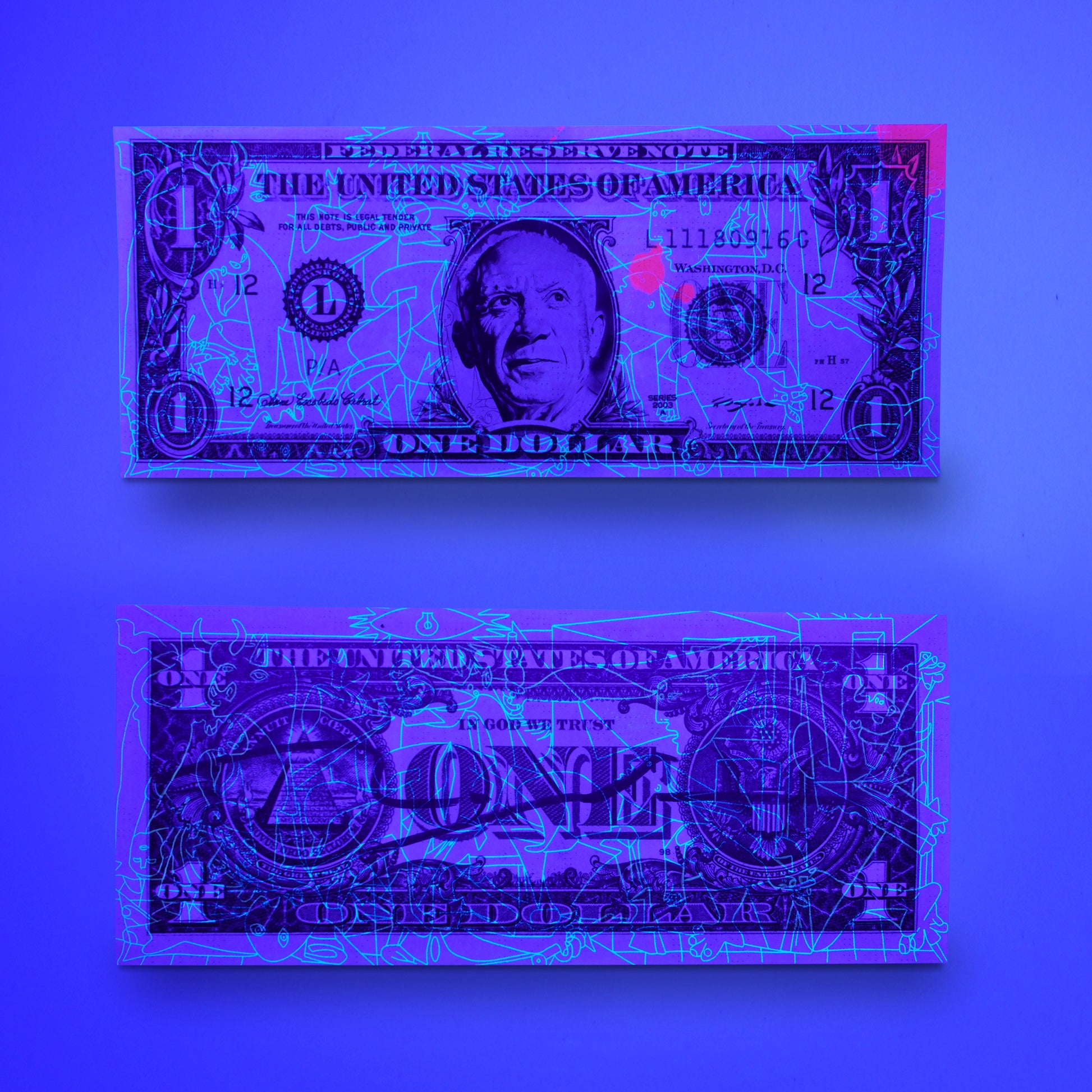 Este dólar infalsificable contiene tinta holográfica y vendrá acompañado de una linterna de luz ultravioleta que al iluminar el billete, revelará la obra más famosa de Picasso: el Guernica.